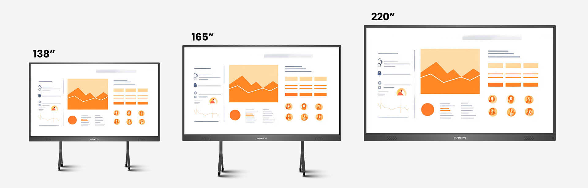 With both mobile and wall-mount options, our displays cater to various setups, offering the convenience of mobility for 138” and 165” models and the stability of wall mounting for larger 220” models.